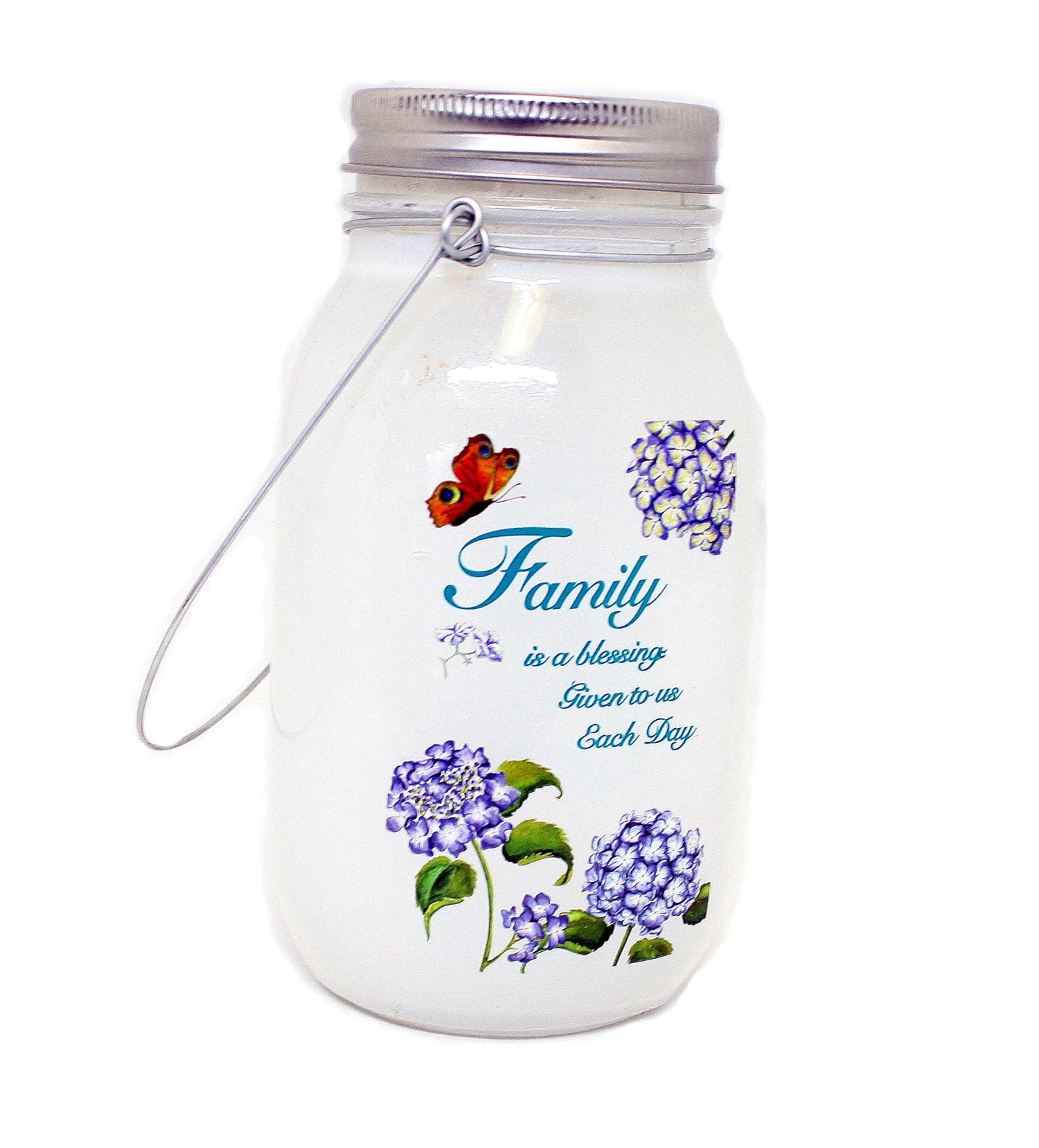 Opaque glass jar with a metal handle and lid. Inside are LED lights. Outside the jar is a variety of flowers and it reads in purple: “Dream for tomorrow live for today.”