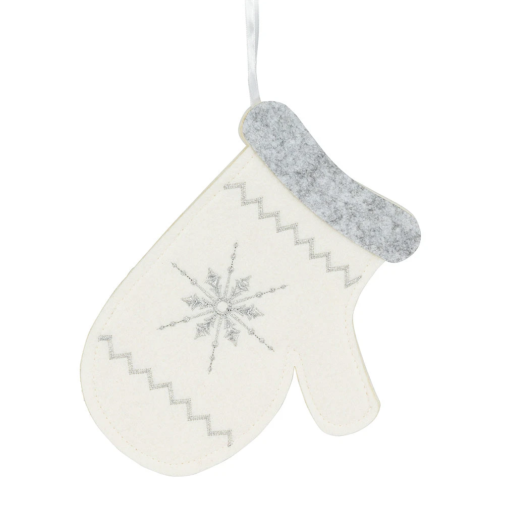 This charming snowflake mitten pocket is the perfect accessory for holiday dining or simply holiday decor. This ivory and silver felt mitten featuring a snowflake design is big enough to hold cards or cutlery – or simply use it to add a festive touch to vases, planters, gift topper and more. .