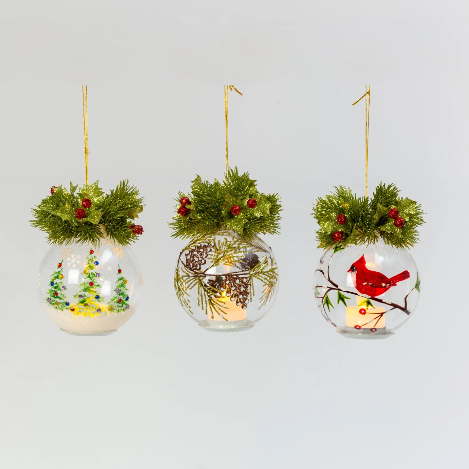 These Battery Operated Lighted Hand Blown Ornaments measure 5.9 inches tall. Adorned with glitter greens and red berries.
