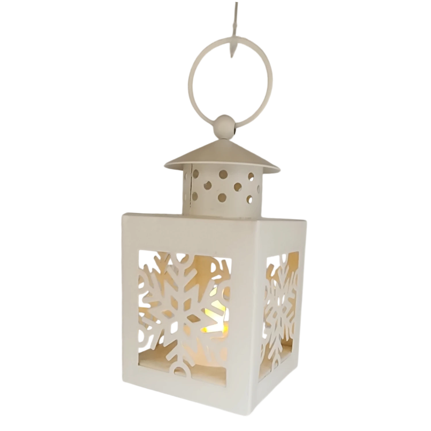 Illuminate your festive season with the enchanting glow of our 4.9″H Battery-Operated Lighted Metal Holiday Lantern with LED Tealight. This charming lantern boasts a sturdy metal construction, painted in a crisp white that complements any holiday decor. Each side of the lantern features an intricate snowflake design, casting delightful shadows and adding a touch of wintry wonder to your space.