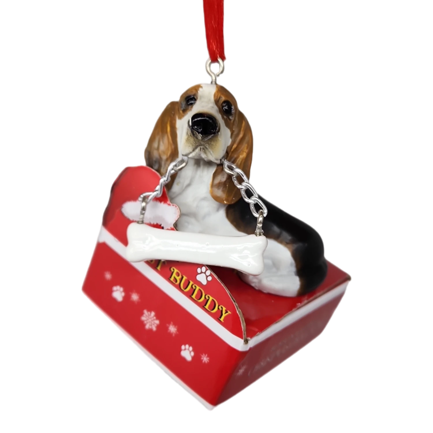 Celebrate the unconditional love of your furry friend with our delightful Basset Hound with Bone Ornament! This charming ornament captures an adorable Basset Hound sitting joyfully, complete with a bone dangling from its mouth. Measuring approximately 3″ x 2″ x 2″, it’s the perfect size to hang on your Christmas tree or display in your home, adding a touch of whimsy and warmth to your holiday decor.