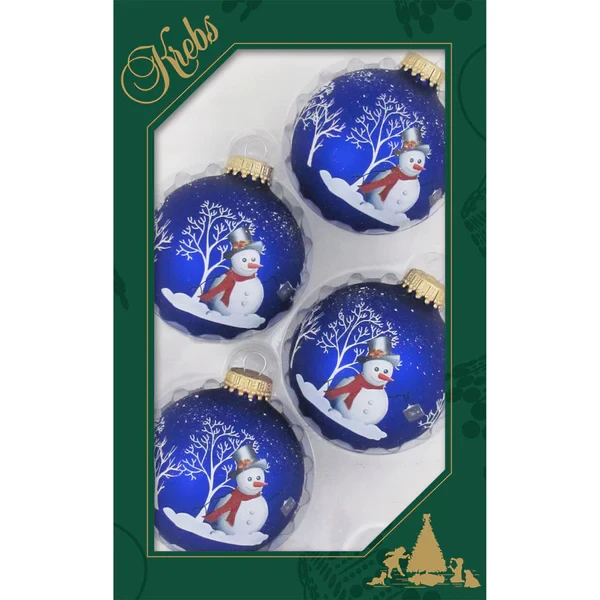 2 5/8″ Glass Balls with a smartly dressed snowman ringing his Winter Bell.
