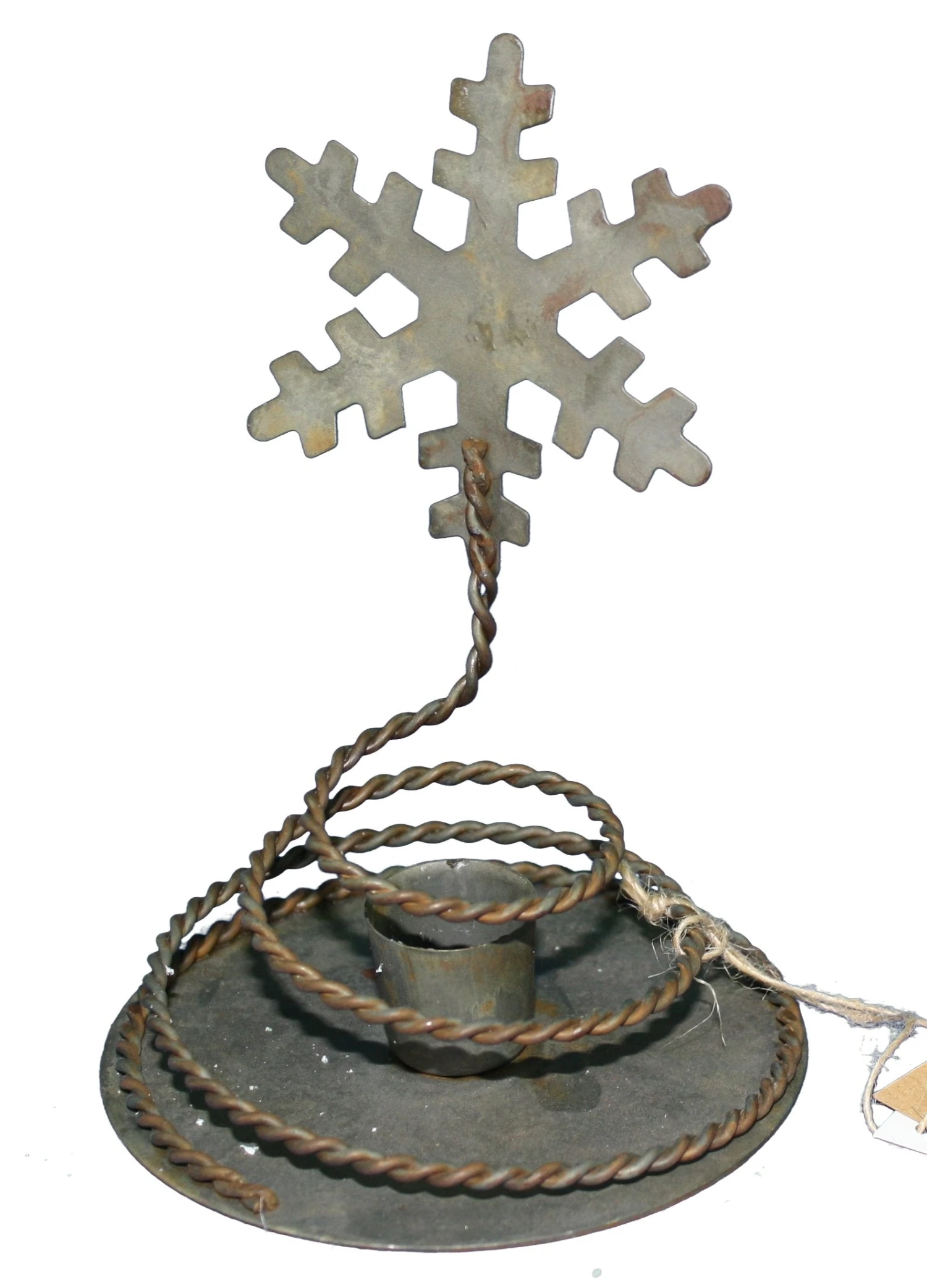 Rustic twisted wire formed into a spring to surround your Taper Candle. Accented with a Metal rustic Snowflake