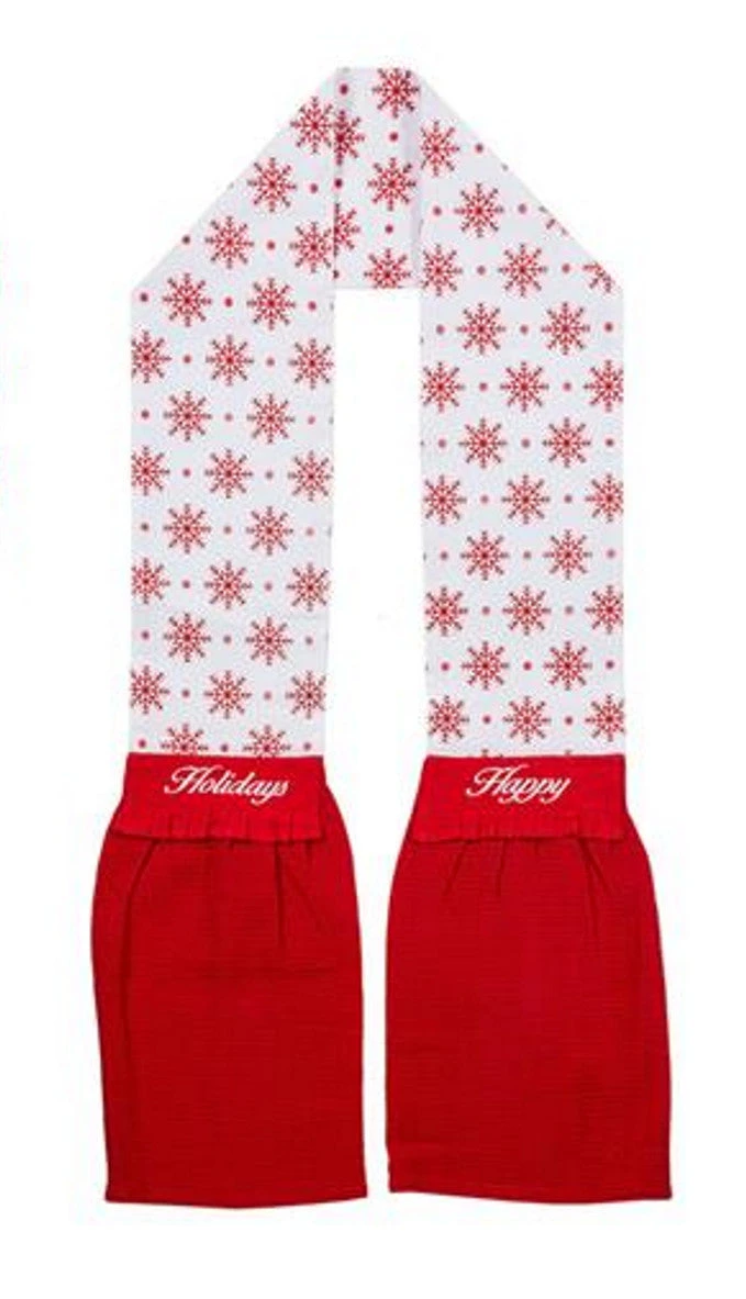- An ingenious design has a very festive, lightweight cotton scarf with a Kitchen Towel on each end. Look your best, keep your hands dry, and even use as a low temp pot holder.