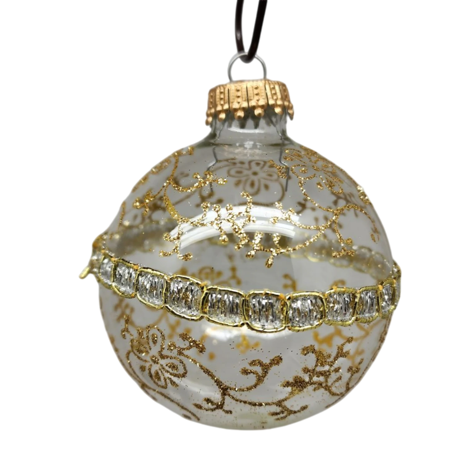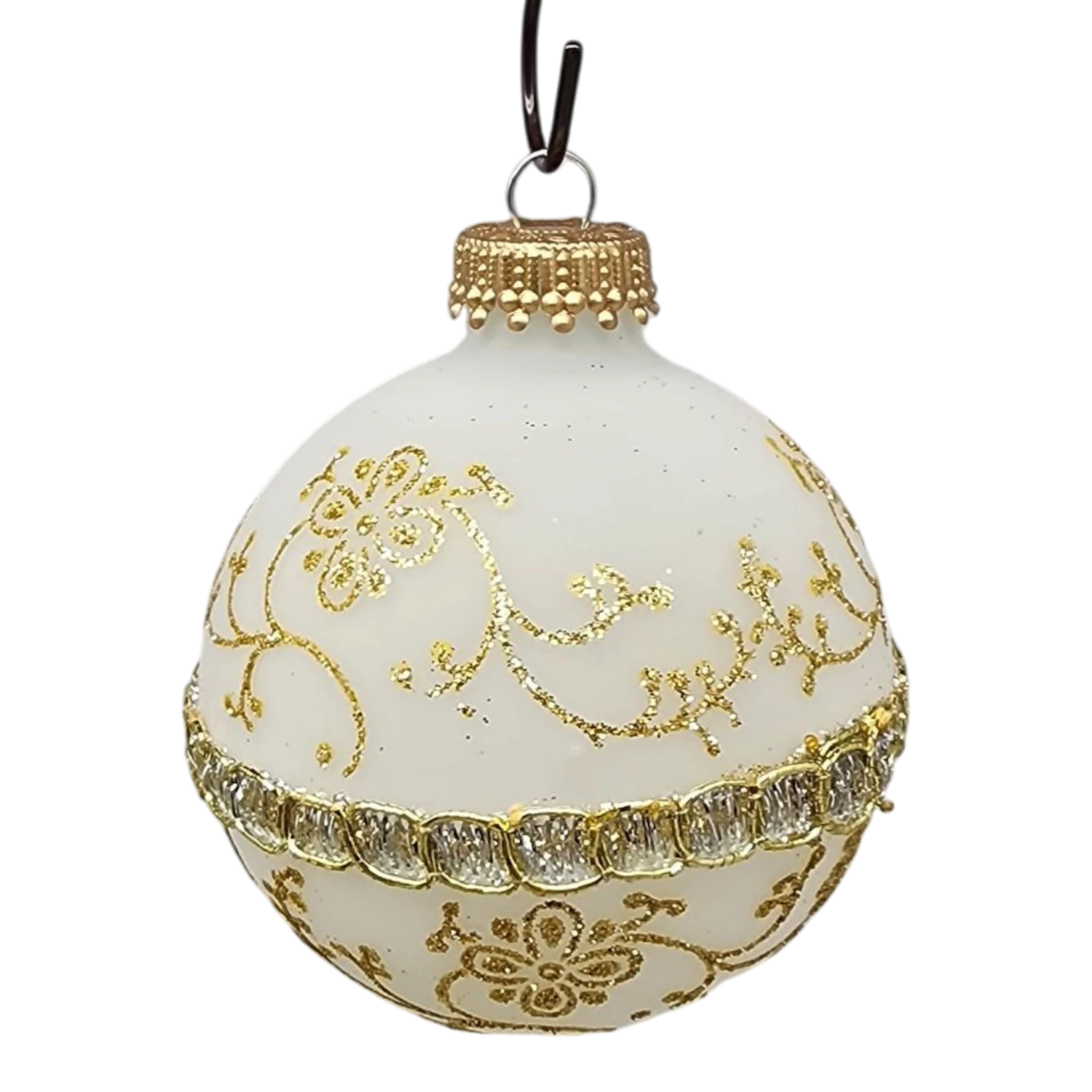 Elevate your holiday décor with our exquisite set of four glass ball ornaments, featuring a luxurious “Gilded Elegance” design that perfectly captures the spirit of the season! Each ornament, measuring just over 2.5 inches in diameter, showcases a beautiful combination of creamy white and shimmering gold accents. The intricate gold floral patterns elegantly swirl around the ornament, beautifully complemented by a sparkling band of gem-like embellishments, creating a look of refined sophistication.