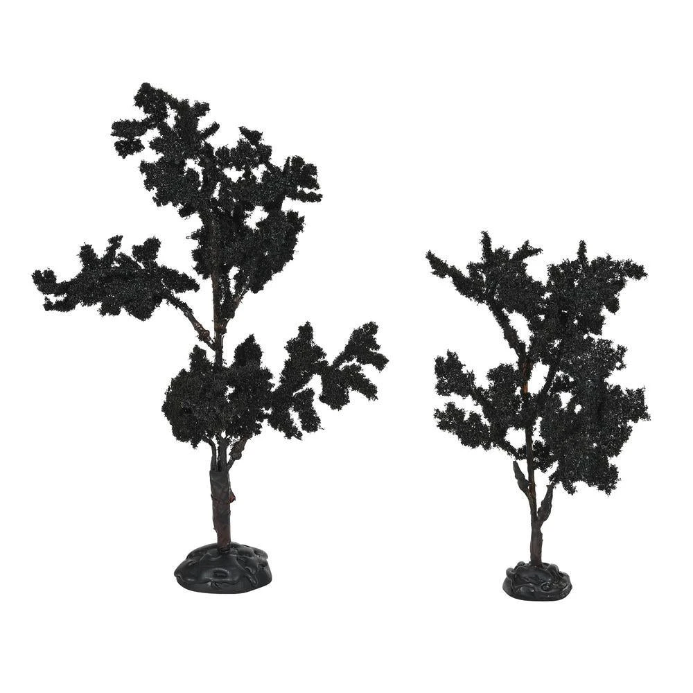 Embrace the eerie essence of Halloween with the Forboding Crowns Tree set! These captivating additions to your Halloween village create a spine-chilling atmosphere with their shadowy silhouette, perfect for setting the mood for a hauntingly good time. Towering above your other decorations, the larger tree stands just over 9 inches high, while its smaller companion rises just over 6 inches. The intricate design and dark tones will surely add a touch of gothic elegance to your frightful festivities.