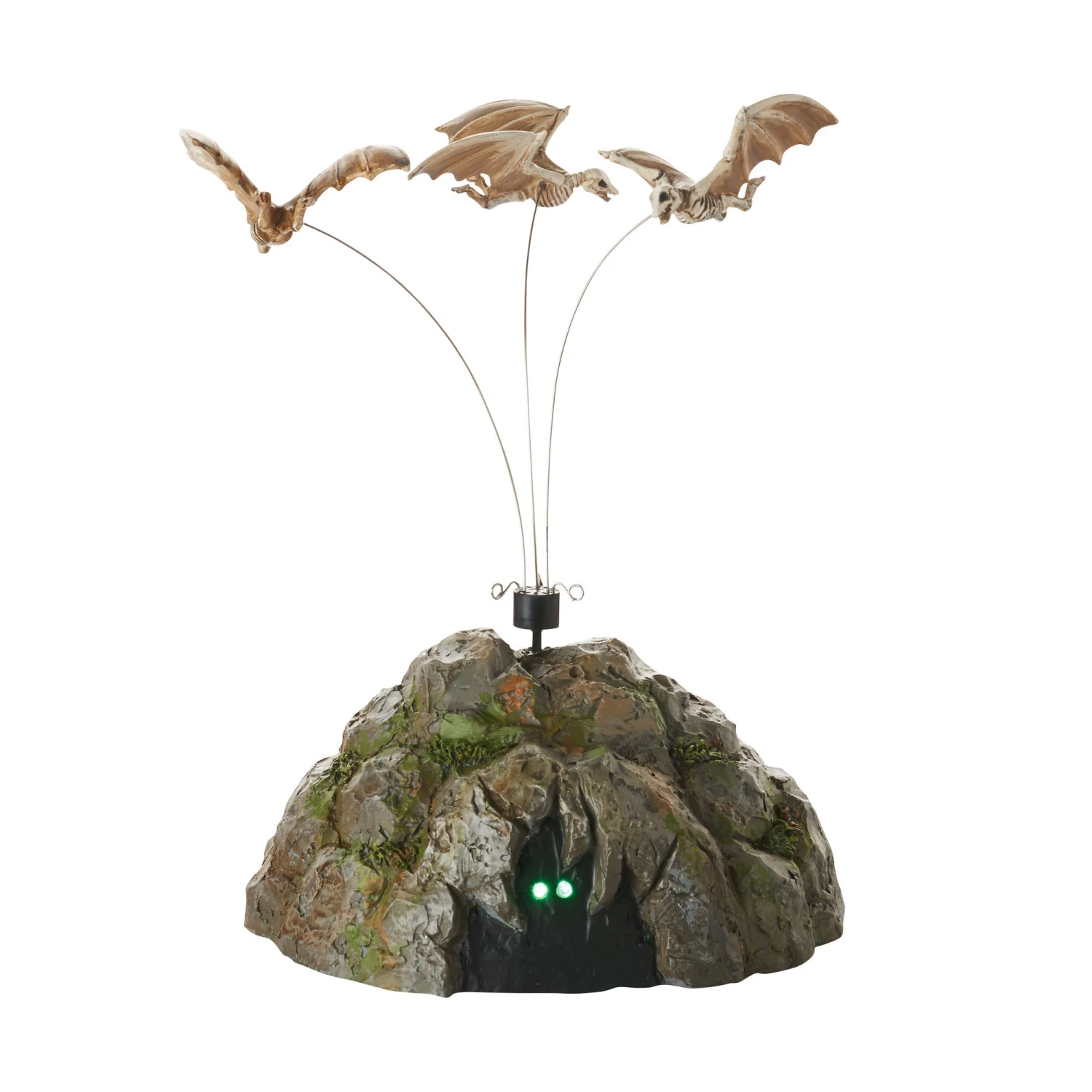Village animated Fright Flight has winged skeleton bat characters that circle the top of the spooky rock which has eyes that glow from the black abyss cave.