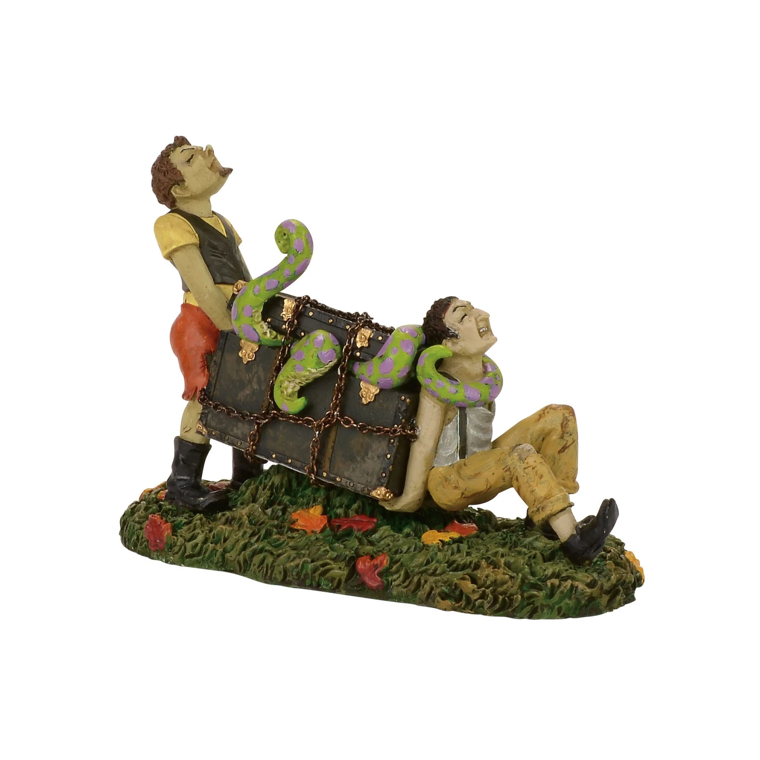 Two porters carry a large traveling truck – the contents of which contains something with several protruding tentacles.