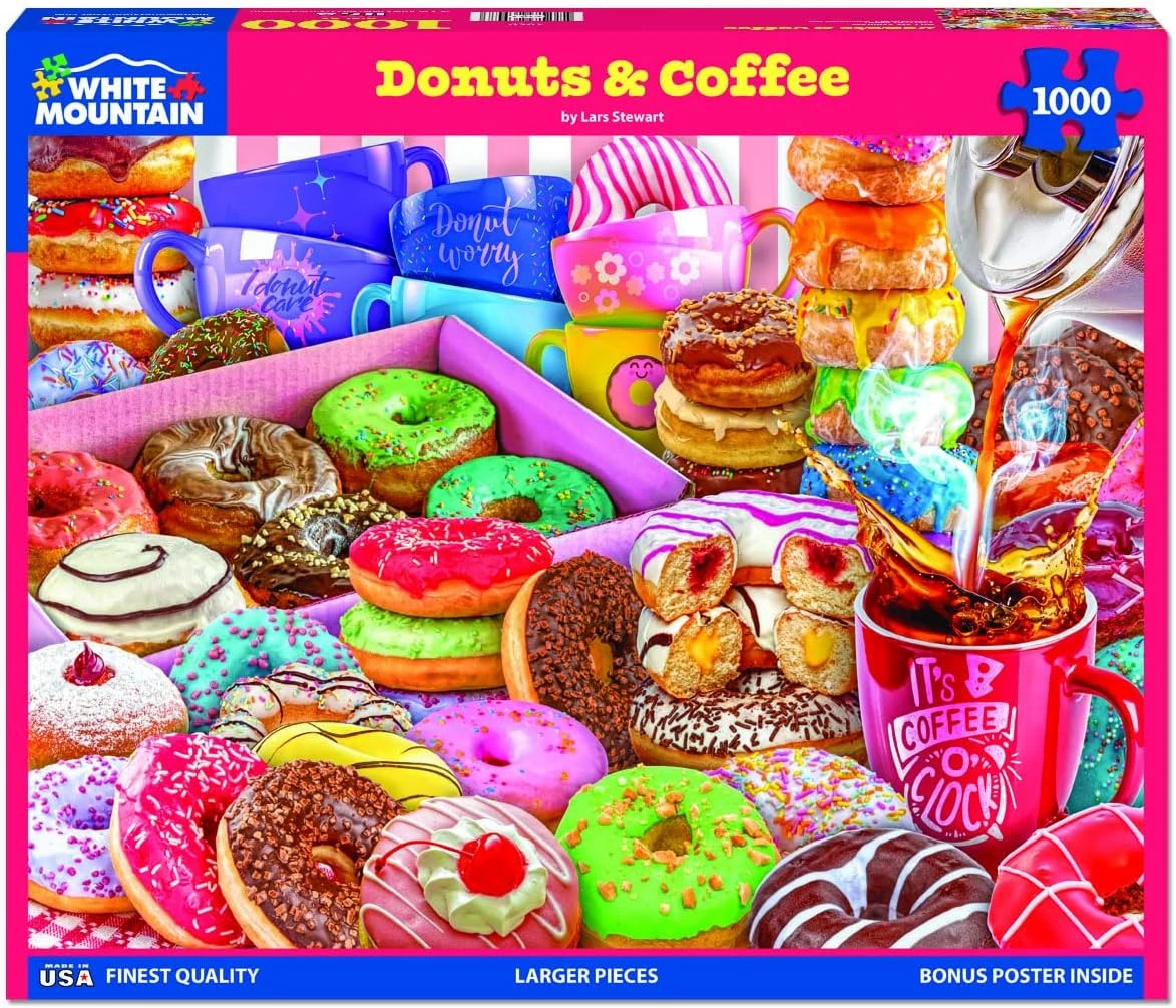 Indulge in the sweet delight of the White Mountain Donuts & Coffee 1000-Piece Puzzle, a charming and vibrant puzzle that brings together the joy of breakfast treats and morning coffee. This delightful scene features an array of colorful donuts, each uniquely decorated and paired with an inviting cup of coffee, creating a perfect visual feast for puzzle enthusiasts. The mouthwatering imagery will not only capture the attention of adults but also spark joy in children, making it an excellent family activity.
