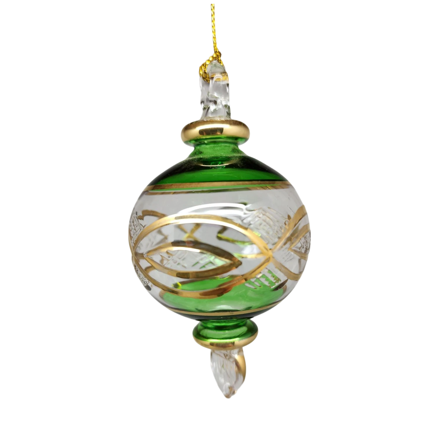 Transform your holiday display with our enchanting mouth-blown glass ornament, standing at just under 4 inches tall. This stunning piece is meticulously crafted in Egypt, showcasing the skilled artistry and rich traditions of glass-making. Accented with genuine 24K gold, this ornament dazzles with its vibrant green hues and intricate designs that dance in the light, making it a splendid addition to your festive decor.
