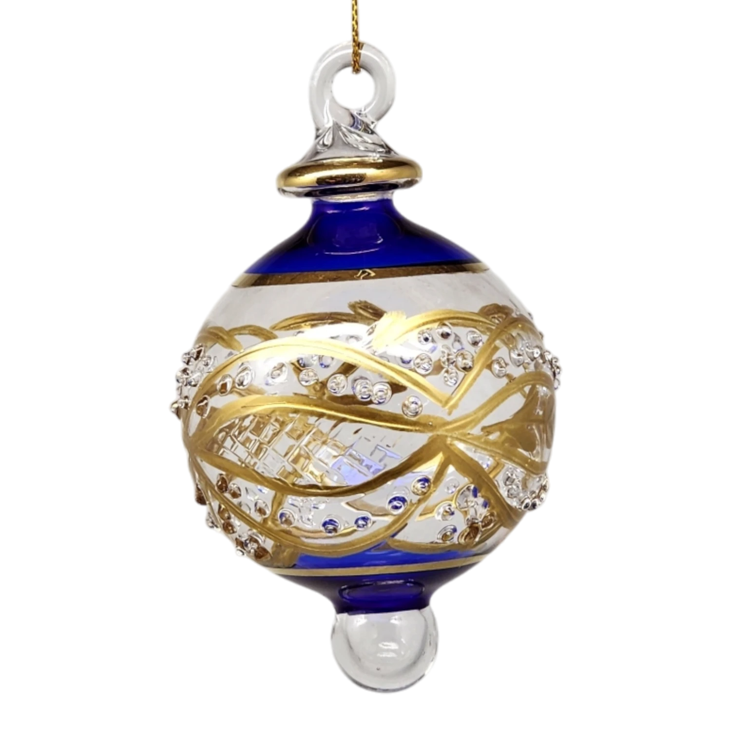 Unveil an opulent addition to your holiday decor with our Floral Etched Stipple Ball in Blue. This exquisite ornament showcases the artistry and precision of traditional glassblowing techniques. Handcrafted from Pyrex, it gleams with intricate etchings, and the elegant embellishment of 10k genuine gold plating ensures its timeless allure. Just over 4 inches long and almost 2.5 inches in diameter, this ornament guarantees a striking presence on any tree or display.