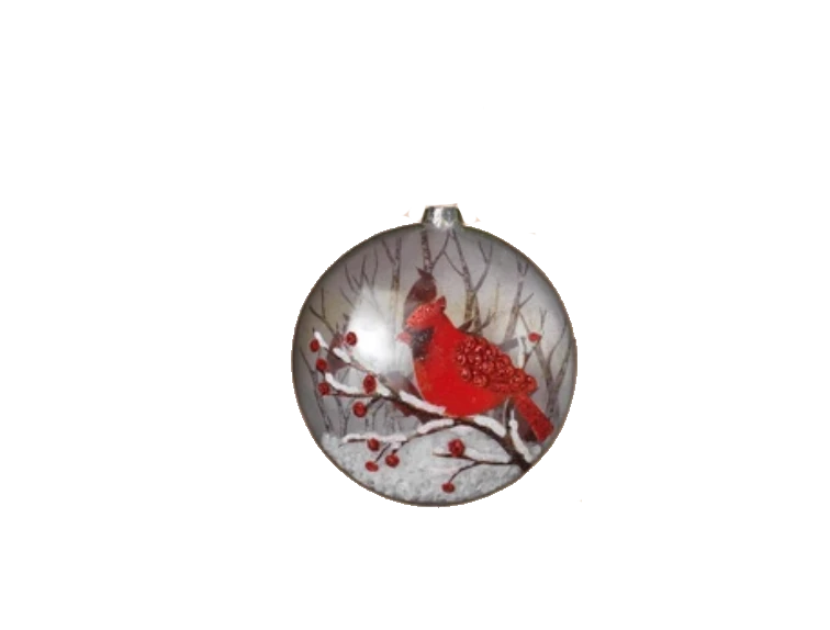 Glass Disc ornament with a Cardinal scene within. The glass is filled with faux snow (the real stuff kept melting!)