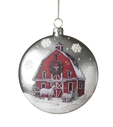 Bring a slice of rustic charm to your holiday décor with this lovely Glass Disc Ornament featuring a picturesque barn scene. Measuring 4 inches in diameter and 1.5 inches deep, this enchanting ornament showcases a beautifully painted red barn adorned with a festive wreath, surrounded by gentle snowflakes and soft winter scenery. The idyllic depiction of farm life captures the warmth of the season and evokes nostalgia for simpler times spent in the countryside.