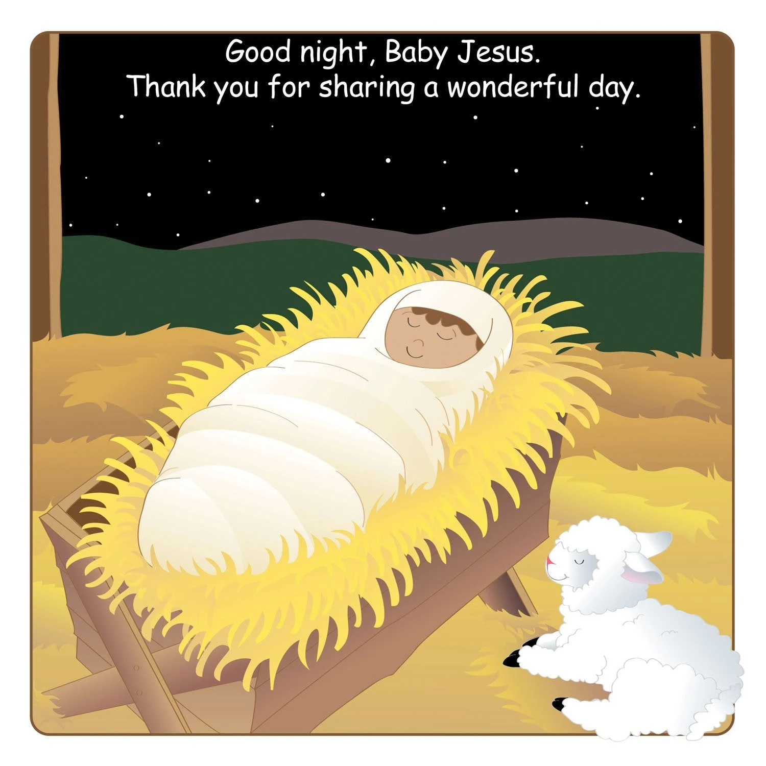 Good Night Baby Jesus features Joseph and Mary, shepherds tending flocks, Bethlehem, farm animals, Wise Men, Baby Jesus, and more. Focusing on the nativity story, this adorable board book tells the birth story of Jesus Christ with colorful and inspiring illustrations
