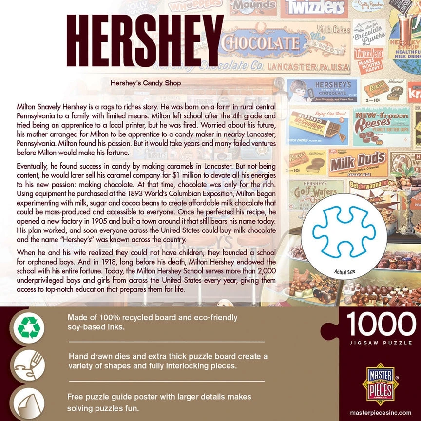 This MasterPieces 19.25″ x 26.75″ 1000 piece Hershey’s Puzzle is full of indulgingly sweet images of a variety of Hershey’s chocolates, and are made with the chocolate lover in mind. These puzzles are the perfect gift for any sweet-toothed friend or family member. To reduce its impact on our environment, the chipboard used in this puzzle is made of recycled material.