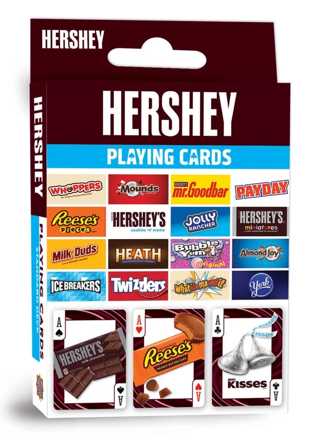 These Hershey playing cards are the perfect deck for any candy fan! Each standard deck contains 52 high quality cardstock cards and 2 jokers. Card-back designs feature the HERSHEY logo. All face cards and jokers have photographs of Hershey’s sweetest candy treats. Officially licensed and approved Hershey playing cards