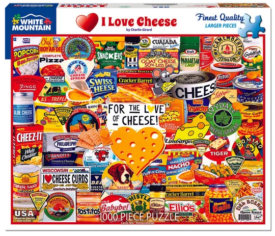 I Love Cheese. And who doesn’t? As long as you’re tolerant, cheese makes everything taste better – from popcorn to pizza to pasta to salad to dips and crackers and junk food, or simply a favorite few bits to accompany and enhance a nice glass of wine. Designer Charlie Gerard has brought all our favorites together on this 1,000 piece puzzle which is sure to make you feel like a big cheese when you complete it! Finished size 24″ x 30″.