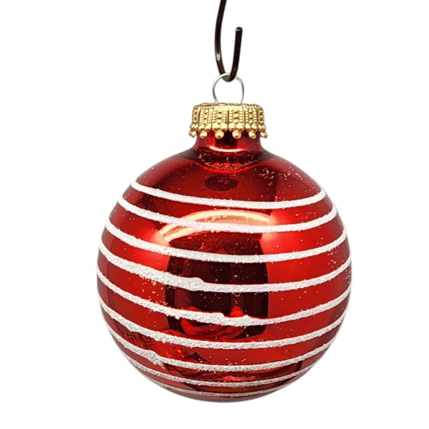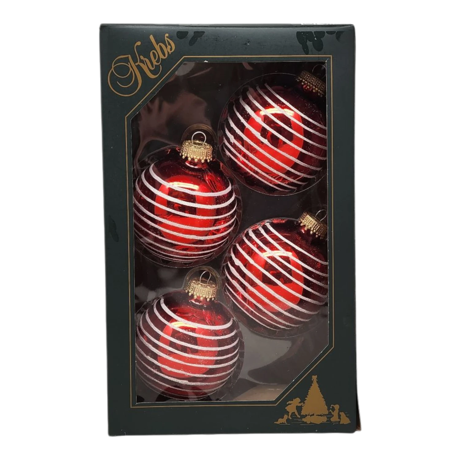 Add a touch of festive flair to your holiday decorations with our captivating set of four red and white striped glass ball ornaments! Each ornament features a vibrant red base, elegantly adorned with bold white stripes that create a cheerful and eye-catching design. Measuring just over 2.5 inches in diameter, these ornaments are perfect for enhancing your Christmas tree or adding a delightful pop of color to your holiday displays.