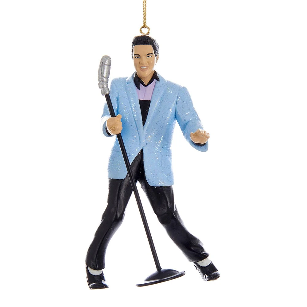 The Elvis® in blue suit hound dog with microphone ornament from Kurt Adler is an remarkable addition to your family’s holiday celebration. The ornament features Elvis® wearing a sparkling light blue jacket, black and white button-down shirt and black pants with black shoes. He is shown in his famous rock dance pose as he tilts the microphone stand with one hand.