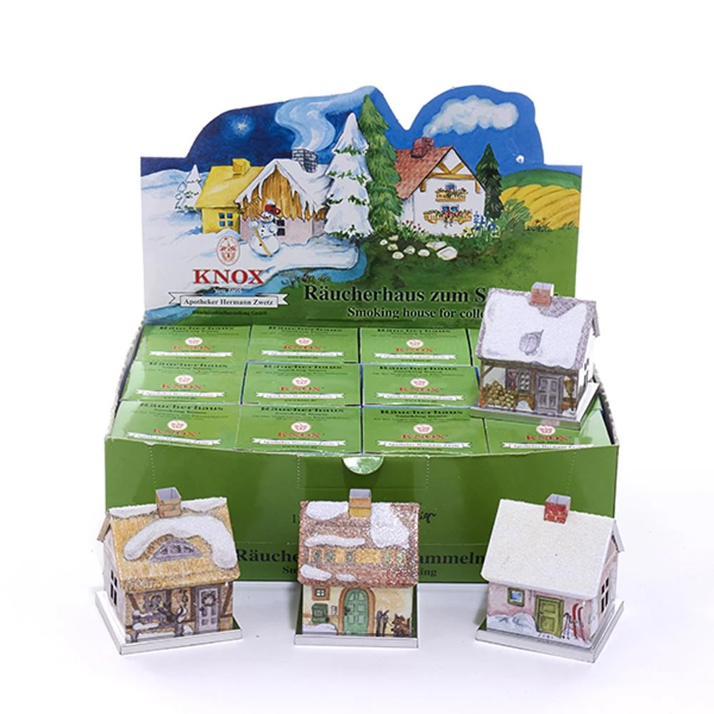 Metal Smoker yellow house direct from Germany. Lift the Metal roof off to place the incense cone and replace the roof. As the incense cone burns, the fragrant smoke comes out the Chimney for a Festive look and smell, plus the cut out windows will shimmer with the burning glow from within.