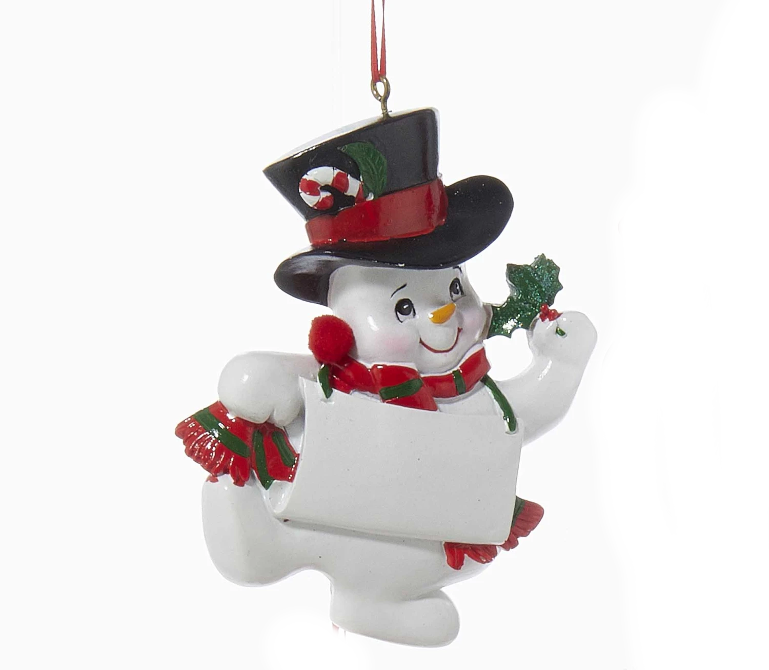 This snow kid wearing a top hat ornament can be personalized and are a delightful addition to any holiday decor or Christmas tree.