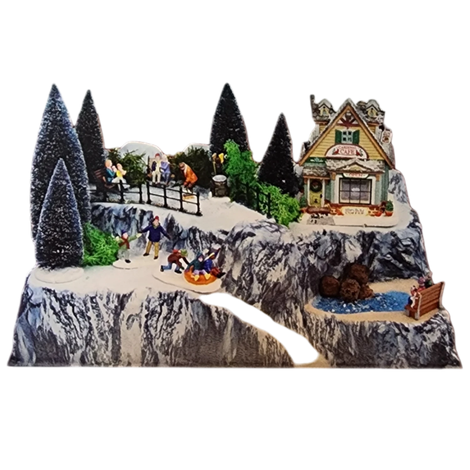 The intricate detailing includes a charming café, complete with welcoming decorations, nestled amid snow-covered evergreens and a peaceful frozen pond. This enchanting landscape is perfect for adding a touch of holiday spirit to your home décor, creating a magical scene that can be admired by both young and old. Whether you’re setting up a holiday village display or looking for a unique decorative piece, this winter wonderland captures the essence of festive joy and warmth.