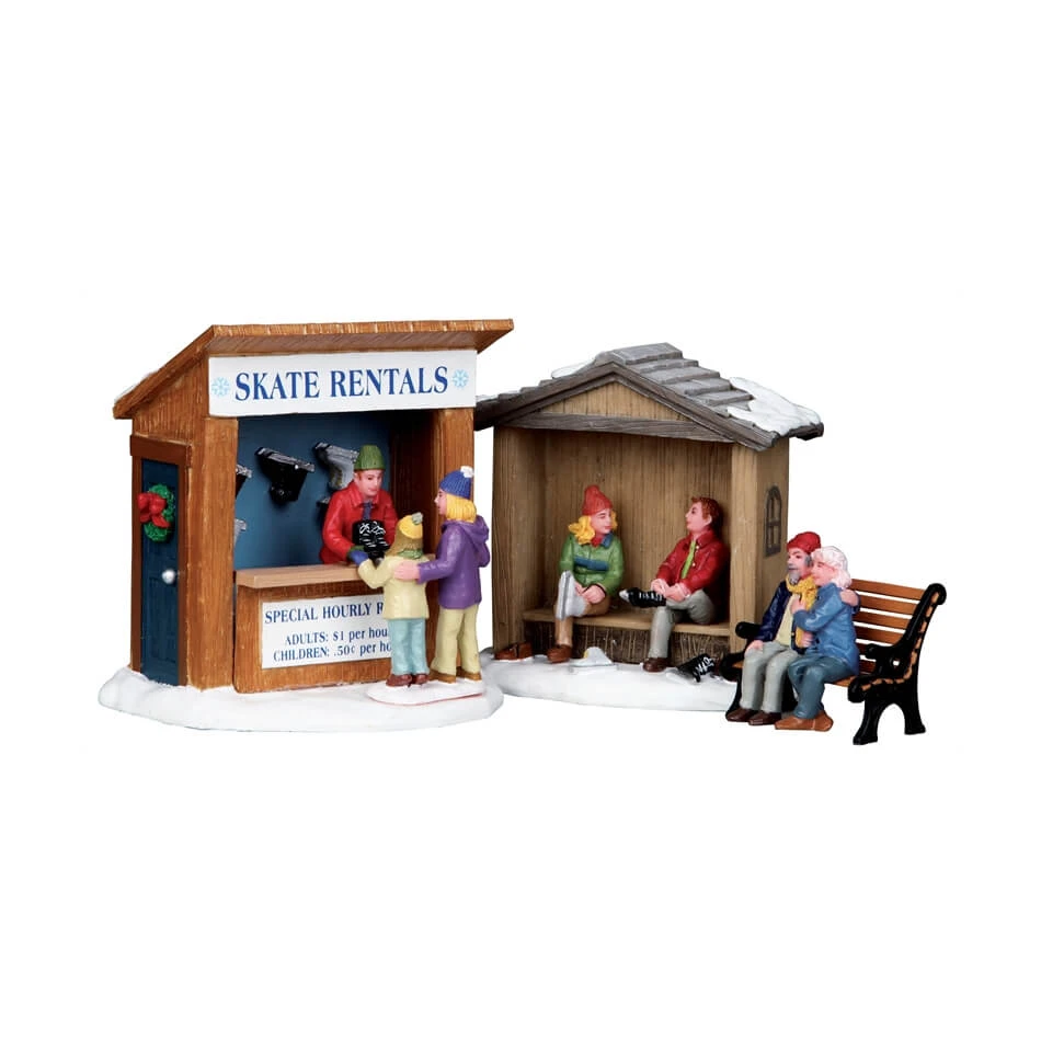 Made from polyresin and consists of a ice-skate rental hut, waiting room and a traditional cast-iron effect bench, along with a number of figures.