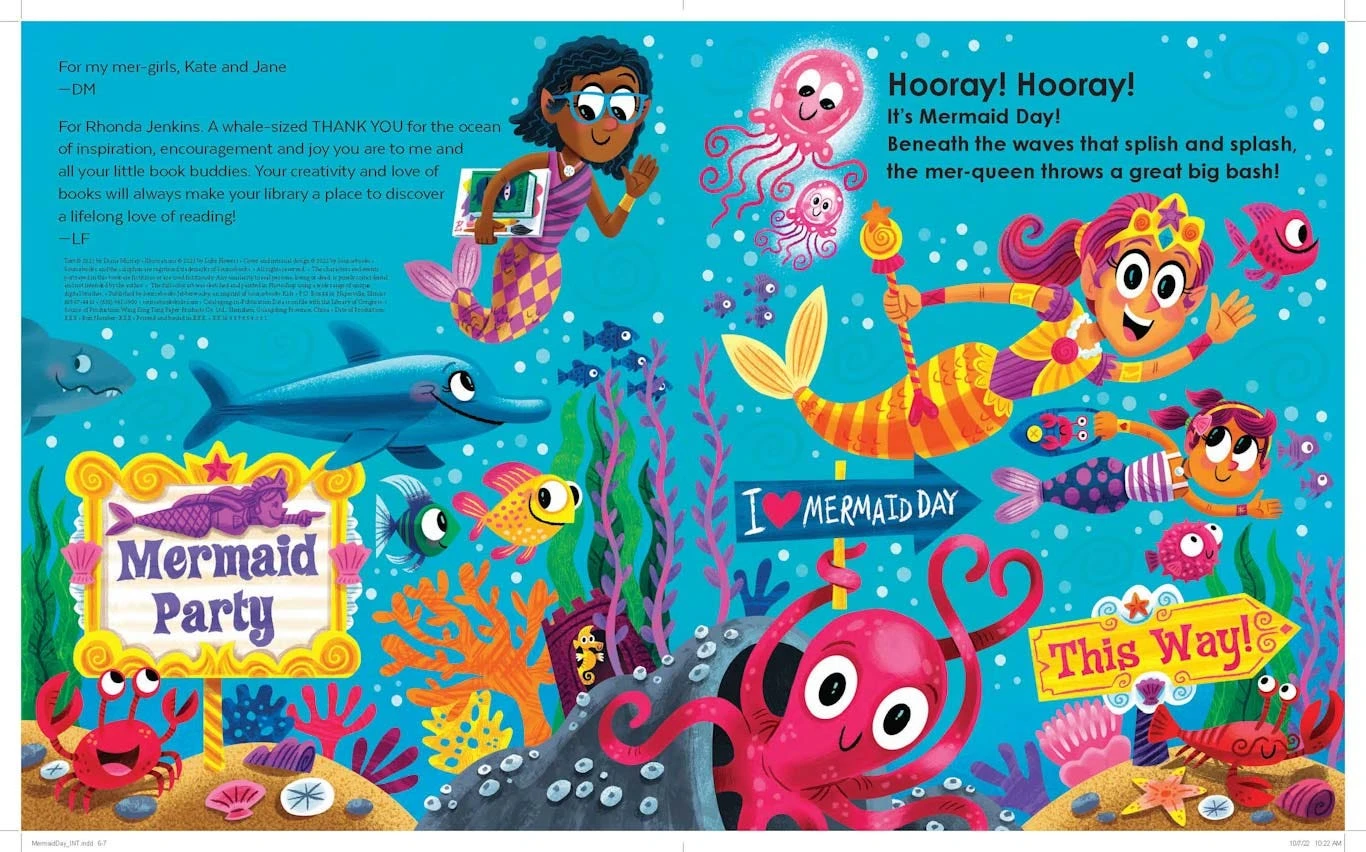 On Mermaid Day, the mer-queen throws a fin-tastic party! She decorates her underwater castle and creatures of all kinds swim inside to celebrate together. Dolphins dance, narwhals play ring toss, and as night falls, the guests prepare to say goodnight to a mer-mazing day. But are all welcome to celebrate under the sea?