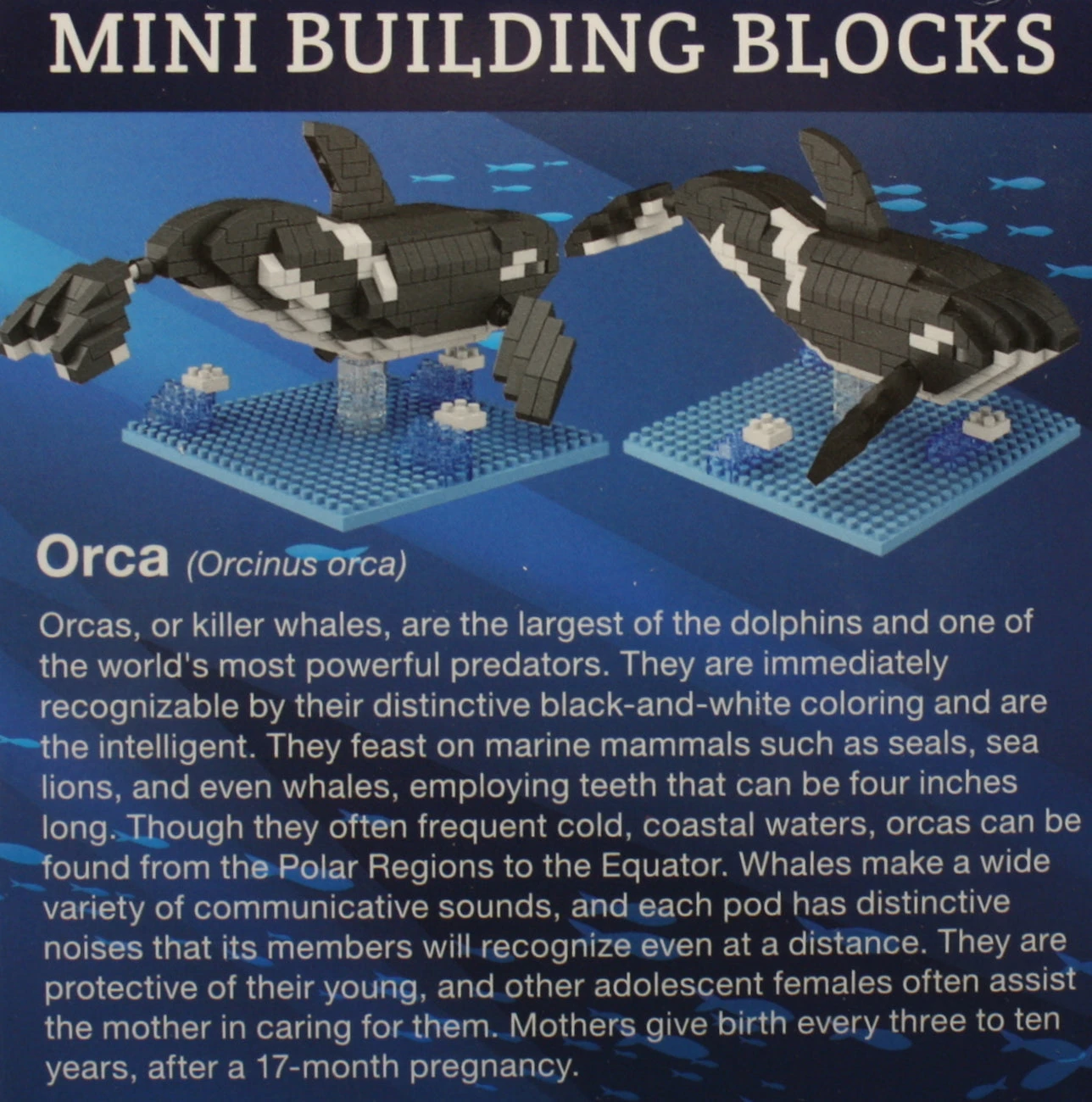 Perfect for young marine enthusiasts, aspiring marine biologists, and anyone captivated by the wonders of aquatic life, the Mini Building Blocks Orca set offers hours of building enjoyment and imaginative play. This remarkable model brings a splash of the ocean’s grandeur into your home, inspiring curiosity about the fascinating life beneath the waves. Add this magnificent orca to your collection and let it transport you to the mysterious and enchanting world of the deep sea.