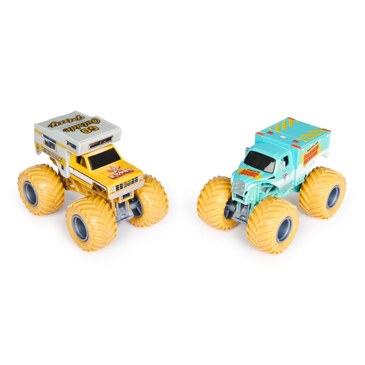 Get ready for an off-road rumble with the Monster Jam 1:64 scale die-cast 2-Pack featuring Wrecking Machine vs. Racing Rescue! This dynamic duo is here to elevate your monster truck collection with their unique designs and thrilling functionality. Wrecking Machine, with its rugged, heavy-duty camper aesthetic, goes head-to-head with Racing Rescue, an adventurous and vibrant off-road vehicle designed for all terrains. Each truck boasts large, robust tires and authentic detailing that perfectly capture the spirit and excitement of Monster Jam.