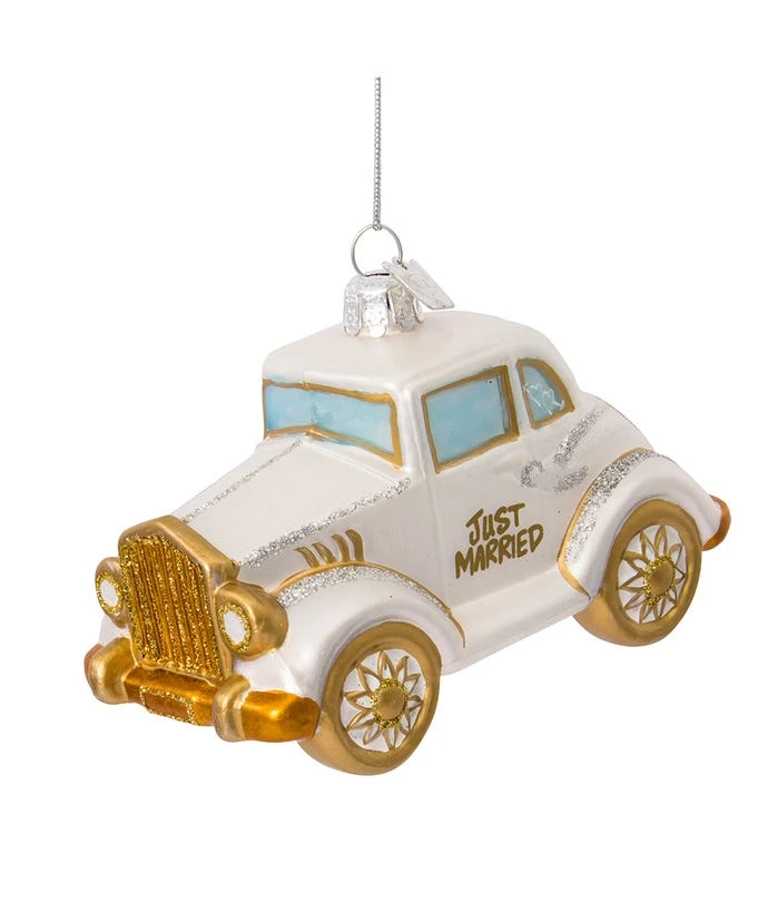 This Noble Gemsâ„¢ wedding ornament set of four from Kurt Adler is the perfect wedding gift, sure to be treasured by the happy couple year after year. These ornaments feature wedding icons with glittery accents including a bride and a groom, a white antique car that says, “Just Married,” a set of golden wedding bells that say, “Mr. and Mrs.” and bride and groom-style hearts that say, “From This Day forward.” The ornaments come packed in a white gift box set. A perfect wedding gift for the newly married couple