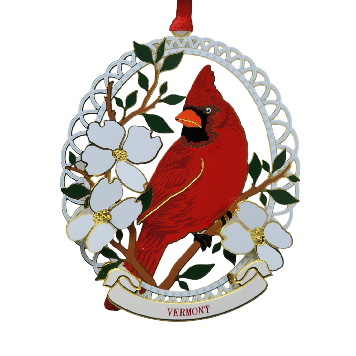 Northern Cardinal Ornament a bright red cardinal perched among dogwood blossoms.
