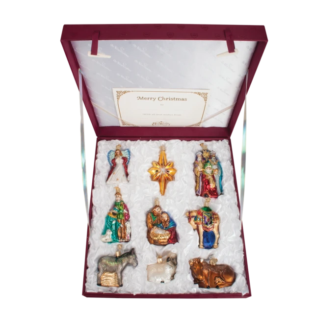 Remember the Reason for the Season with our Nativity Collection. Our 9-piece blown glass ornament collection includes: Harkening Angel, Christmas Star, the 3 Wise Men, Shepherds, the Holy Family, Royal Camel, Donkey, Sheep and Cow ornaments. This assortment of collectible Christmas ornaments is packaged in a keepsake box, which can be used for storage. Our figurine Christmas ornament collection is wonderful way to create Traditions to Cherish!
