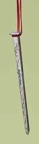 Polyresin Nail ornament with a metallic Silver finish hanging from red cord.