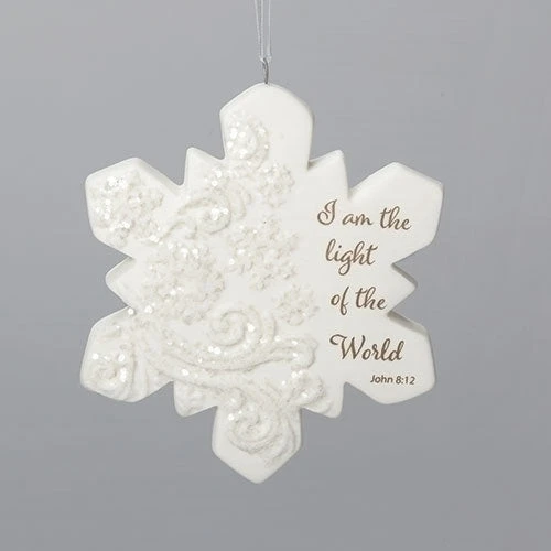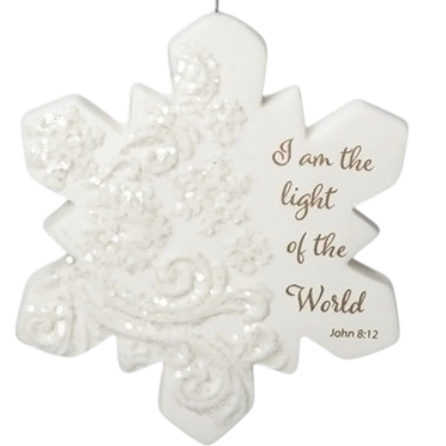 I Am the Light of the World Porcelain Snowflake ornament with The Legend of the Snowflake: Long ago, a glittering star led the way to a Holy Child. And today it is said that swowflakes are tiny pieces of that very star, sent to lead our hearts anew to Jesus, The Light of the world.