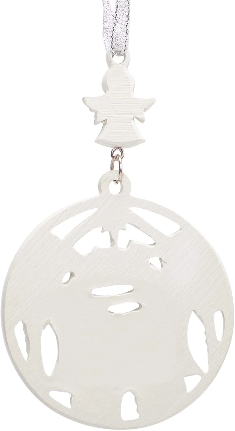 Baby’s First Nativity Ornament features glaze painted nativity scene including Holy Family and palm trees and an angel on string with ” Baby’s First Christmas” sentiment