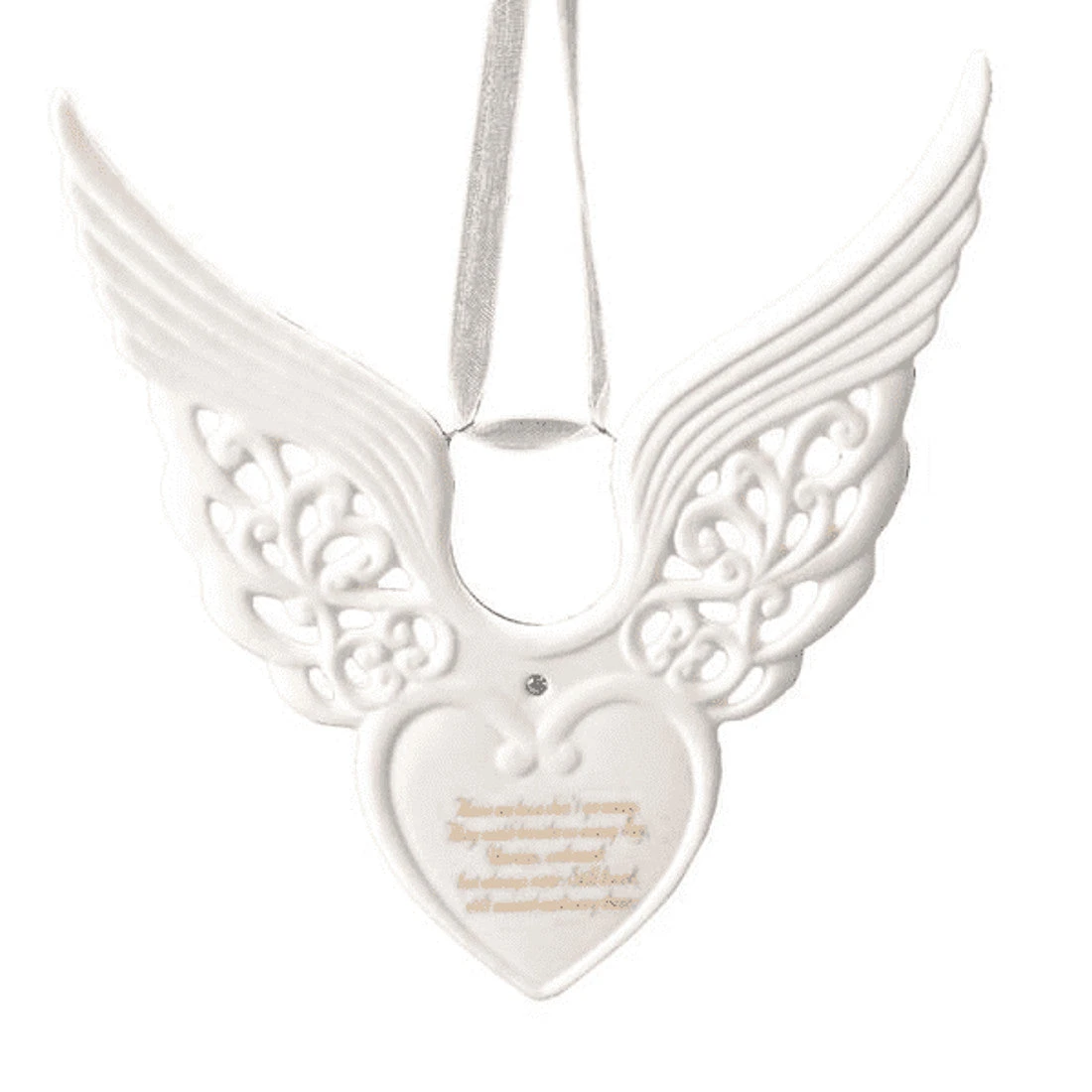 Offer a meaningful and lasting expression of sympathy with the Angel Wings keepsake ornament. The heart shaped porcelain ornament is detailed with angel wings and has a special verse of comfort.
