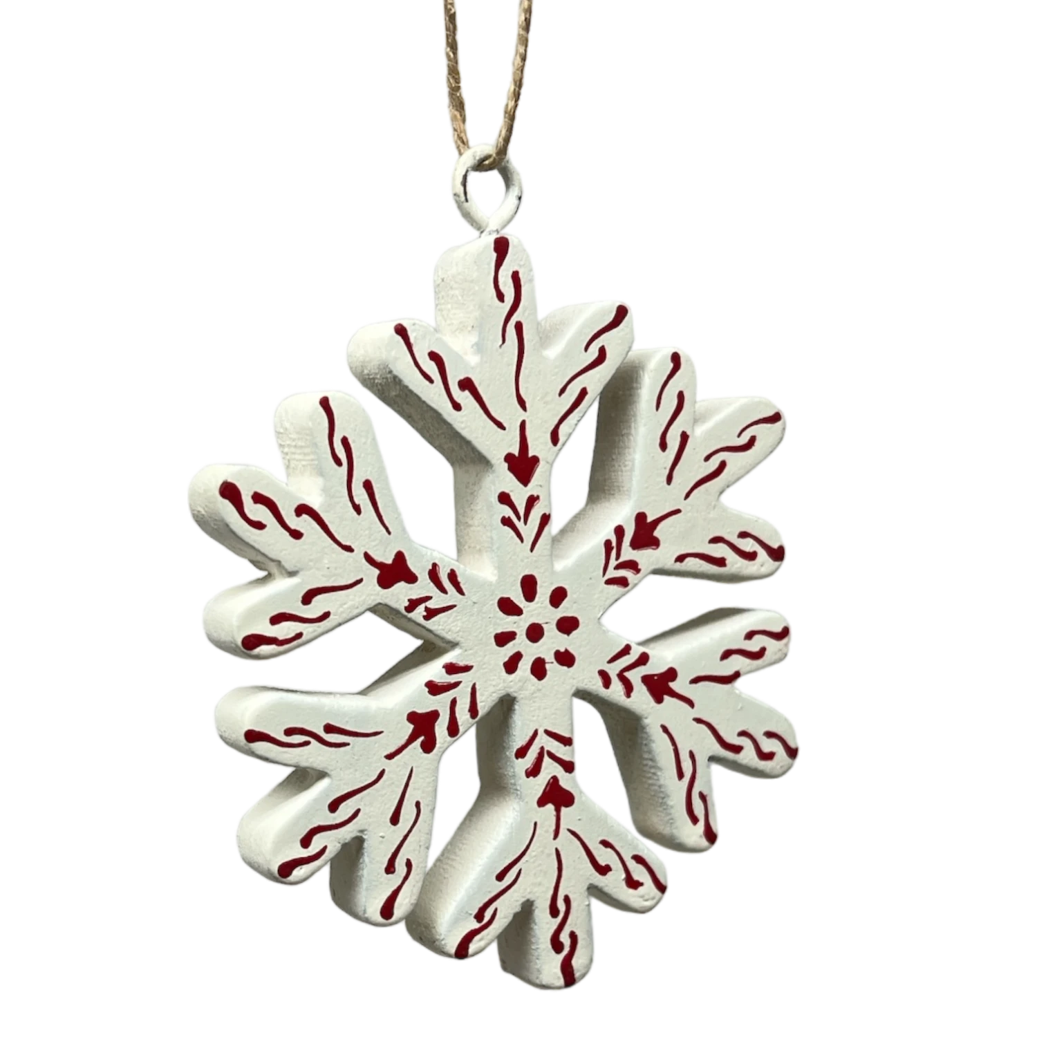 Capture the essence of Nordic winter wonderlands with this exquisite Scandinavian-style wooden snowflake ornament. Measuring 3 by 3 inches, this charming piece features intricate hand-painted red patterns on a pristine white background, reminiscent of traditional Scandinavian festive decor.