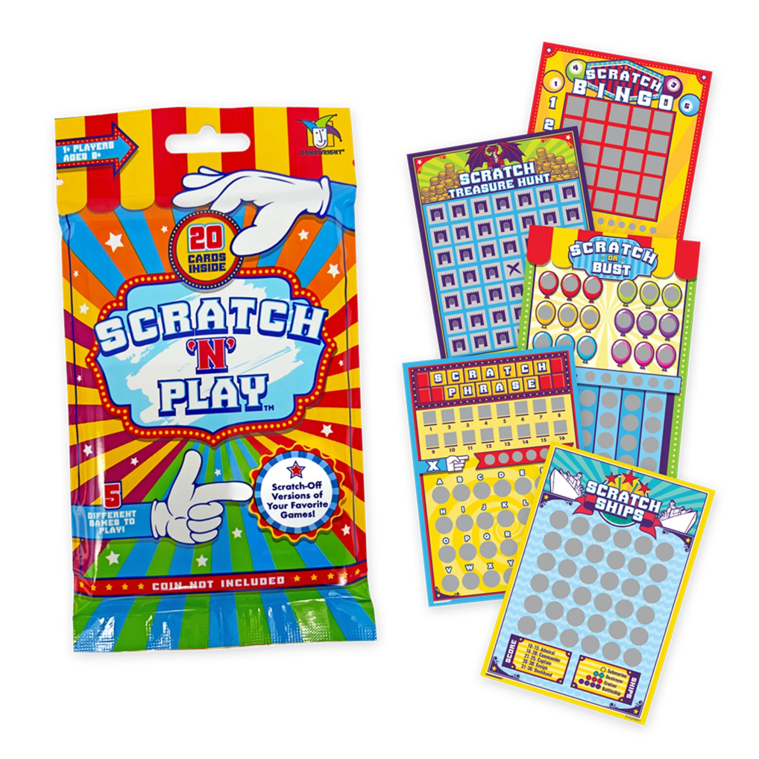 Every card’s a winner inside this variety pack of Scratch ‘n’ Play games! Each pack contains 20 scratch-off cards, featuring solo versions of five classics — Battleship, Bingo, Hangman, and more. Oodles of entertainment to play at home, on-the-go, or just about anywhere you get the itch to scratch!