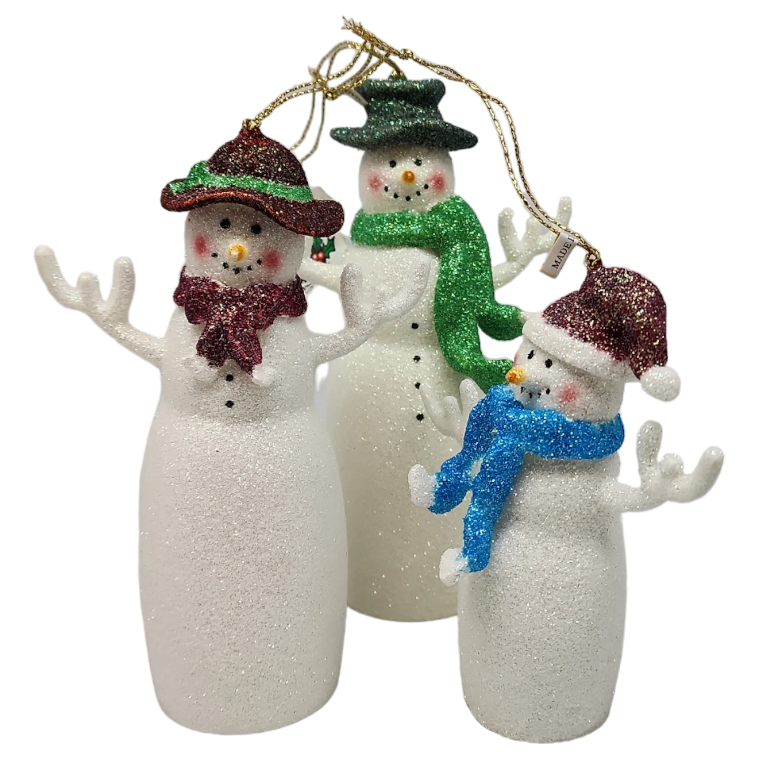 Classic Snowman family made from Acrylic molds and then painted in a glitter finish.