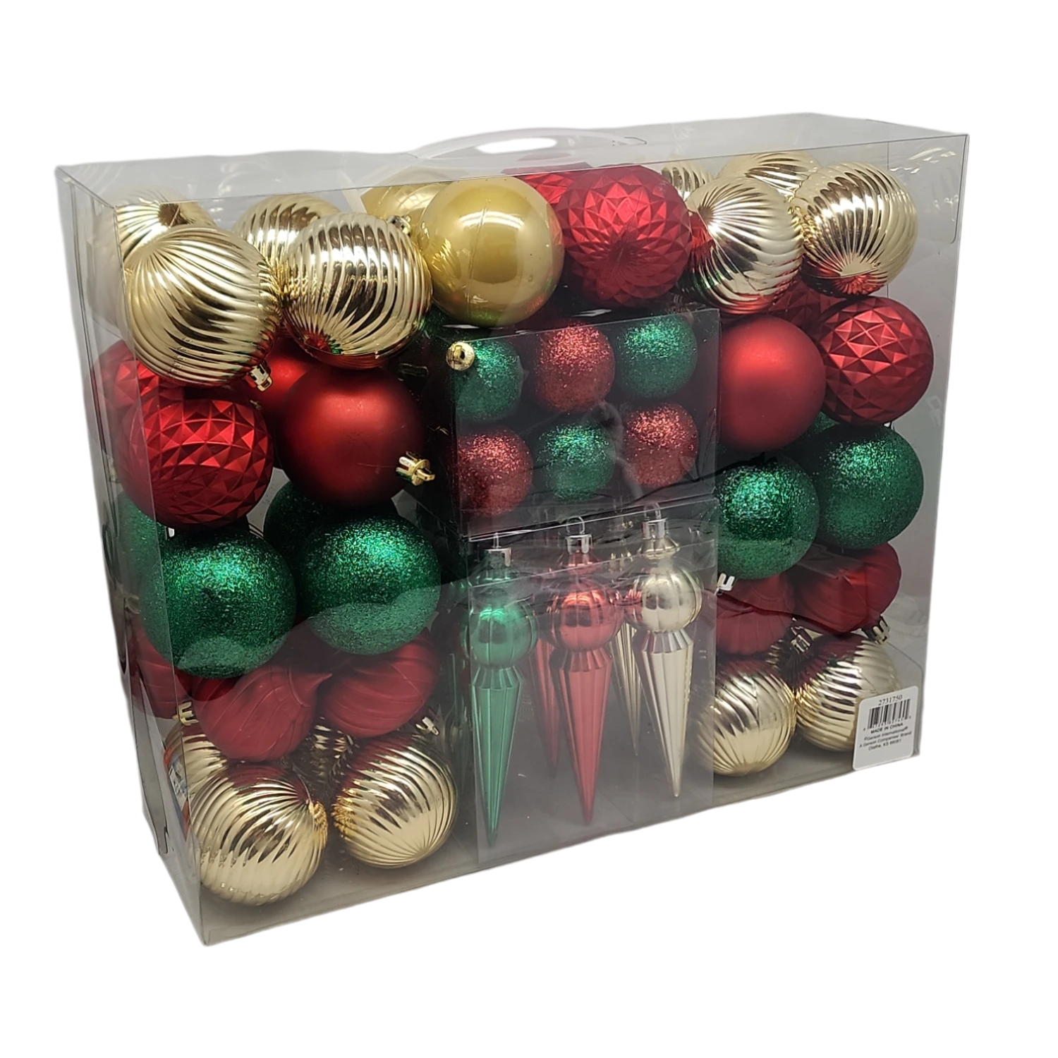 Packed in a convenient storage box, this set ensures all your ornaments are safely stored and easily accessible for decorating year after year. Perfect for adorning your tree, wreaths, garlands, or holiday centerpieces, these ornaments bring a cohesive and festive touch to your home decor. Celebrate the holiday season with this versatile and thoughtfully curated ornament set that combines timeless elegance with practical durability.
