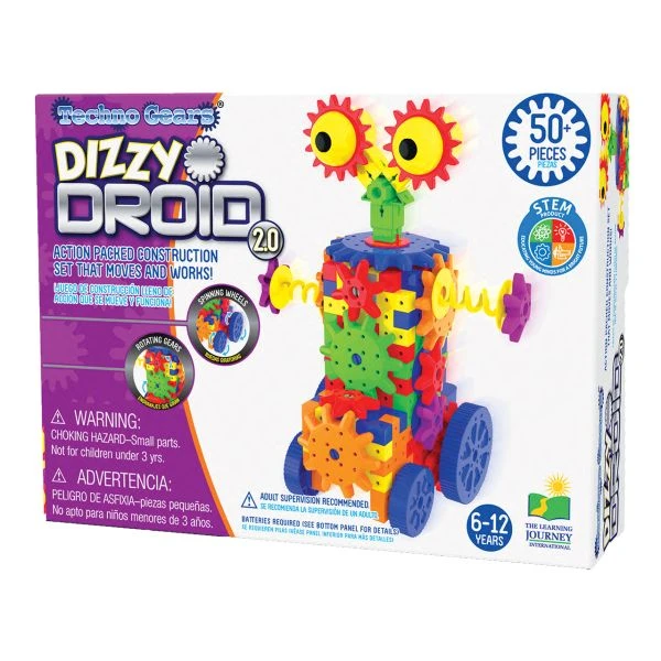 Kids love to construct and the Techno Gears Dizzy Droid kit is the perfect way to encourage your little builder. With 50+ colorful construction pieces, power motor, and more, this kit includes everything your child needs to build their own droid with motorized gears. The mechanics of the droid include gears and will introduce them to and allow them to experience the science of gear ratio. This product aligns with STEM (Science, Technology, Engineering, and Math) standards.