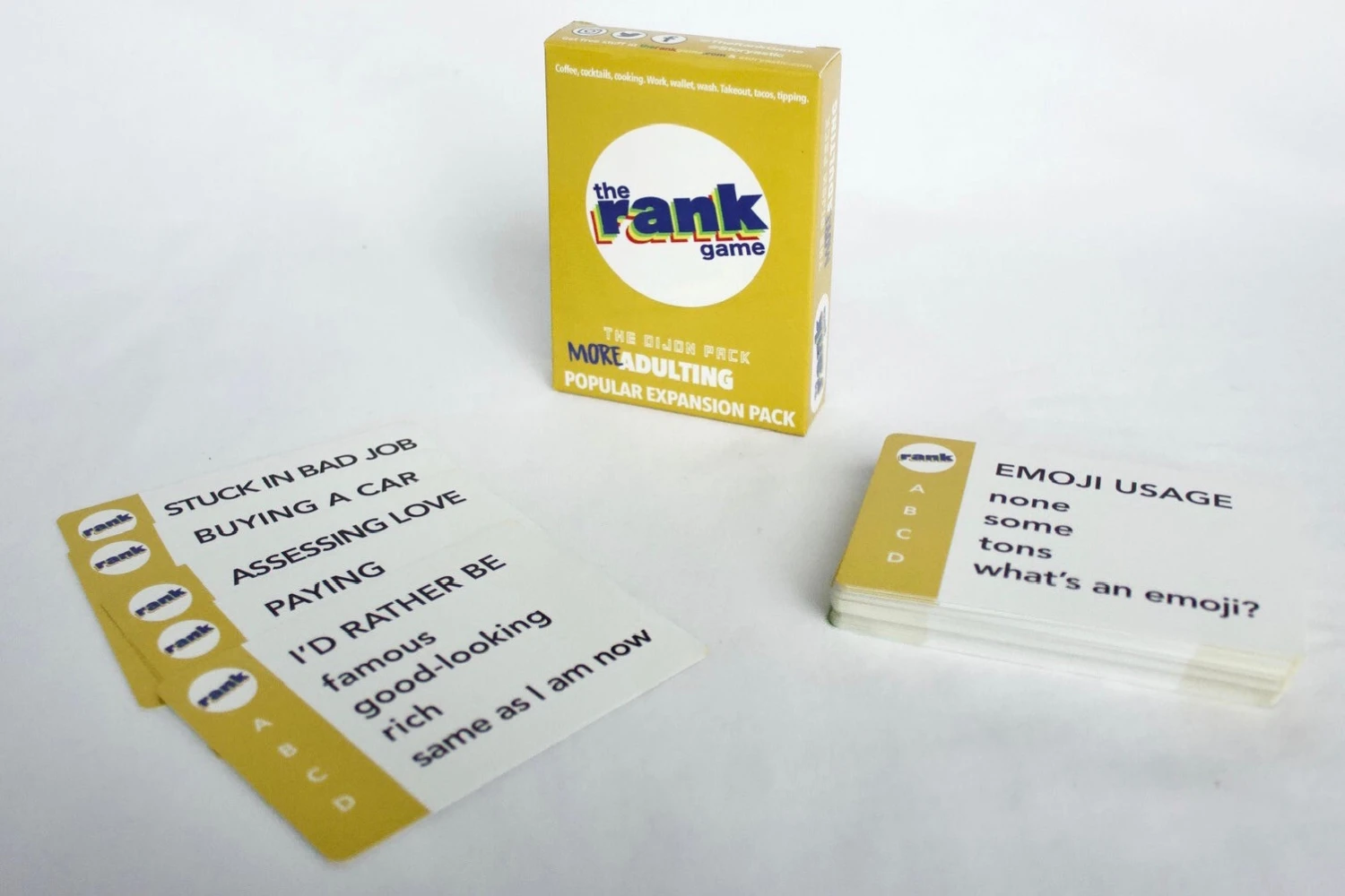 Double your “Adulting” topic cards in The Rank Game with the “MORE Adulting” category deck of 50 topic cards about cooking, cocktails, coffee, work, washing, wallets, take out, tacos and tipping.