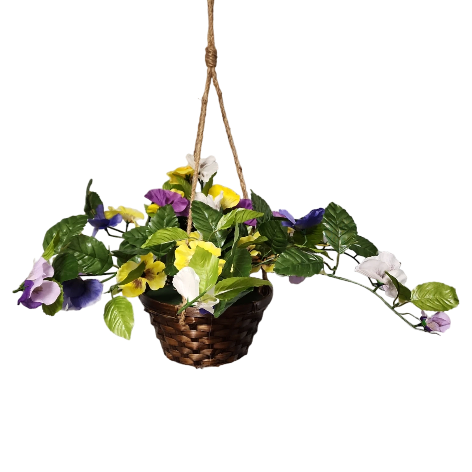 An 8-inch diameter real bamboo hanging basket filled with an assortment of Trailing Pansies. The ideal spring and summer home decor, the classic basket and assorted flowers bring color and life to your decorations