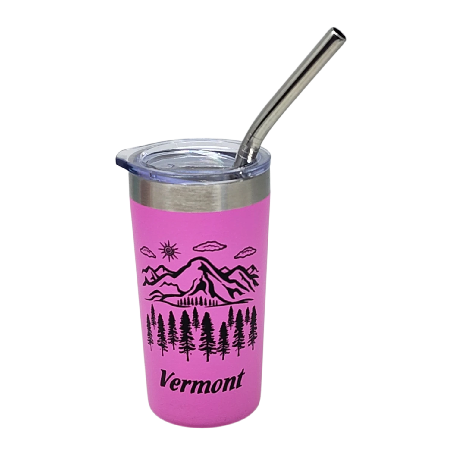 This sleek 2 oz stainless steel shooter is a perfect blend of style and functionality, designed to elevate your drinking experience. Its vibrant Pink exterior features a minimalist black silhouette of a Mountain scene, capturing the essence of Vermont’s natural beauty. The graphic design adds a touch of wilderness charm, making it an ideal keepsake for nature lovers and those with an affinity for the Green Mountain State.